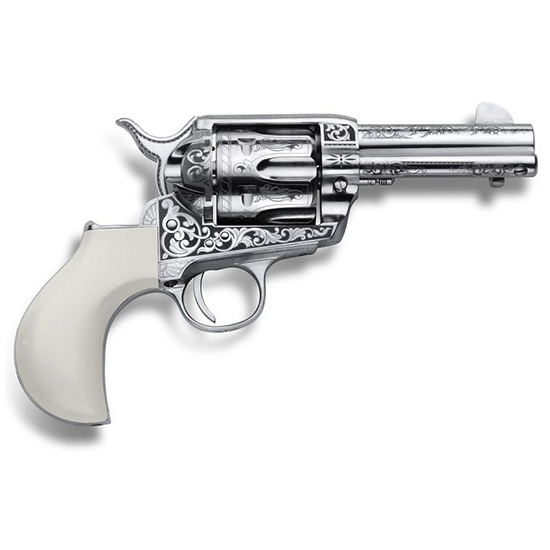 The Huckleberry features 3.5″ barrel, nickel finish with laser engraving and “Huckleberry” engraved on the backstrap. It is chambered in 45LC and has a Poly-Ivory grip.
