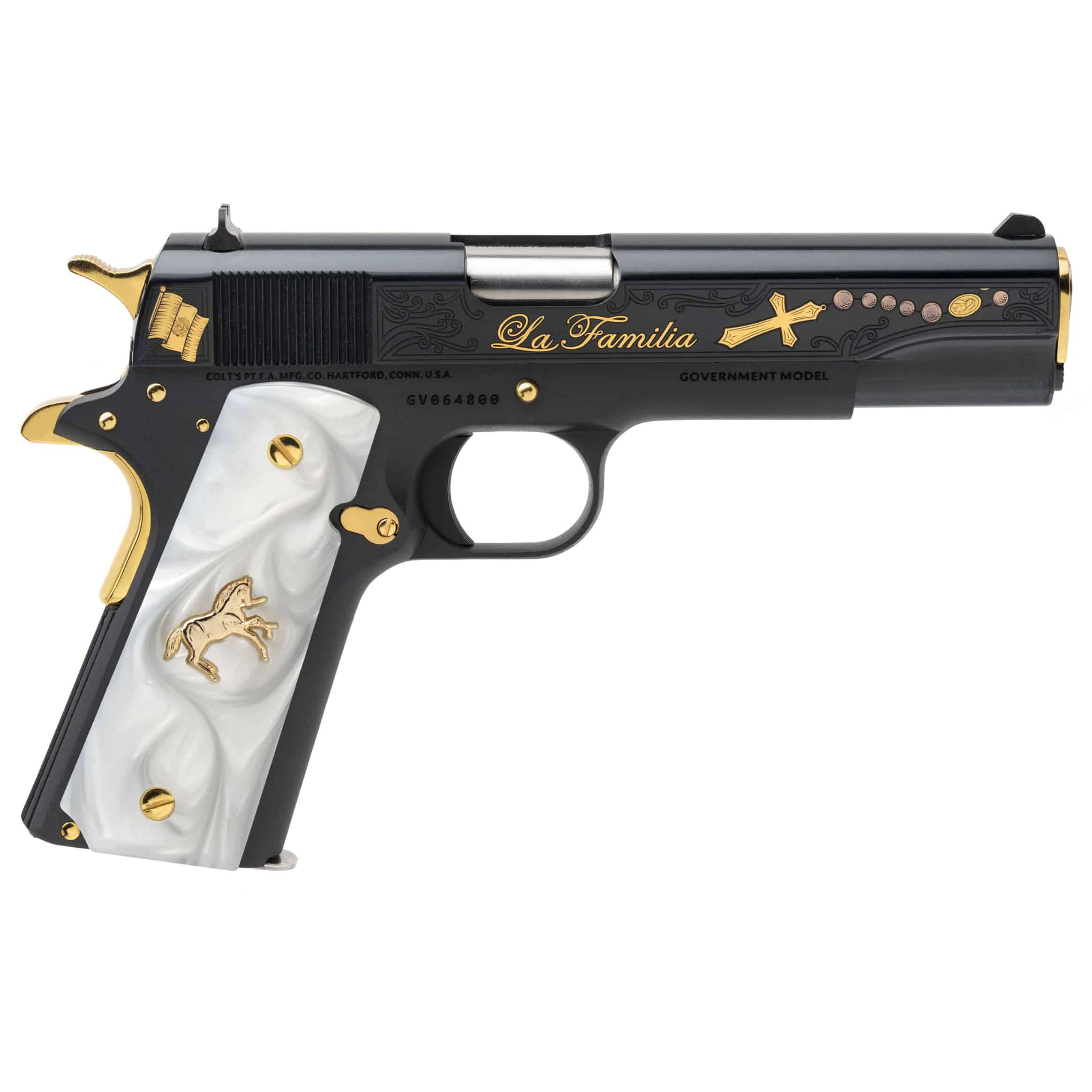 Capturing the heart of  those who embrace the Hispanic heritage, the Colt 1911 La Familia is more than just a collector’s piece—it’s a tribute to family, faith, and culture. This classically designed firearm features a timeless blued finish, adorned with  an engraved / rose gold-plated rosary and 24kt gold inlay details, representing the deep tie to Catholicism roots. The pearlescent grips add a touch of elegance, completing a design that reflects the heart of the cherished bonds of family and faith, making it a meaningful representation of cultural pride and legacy.