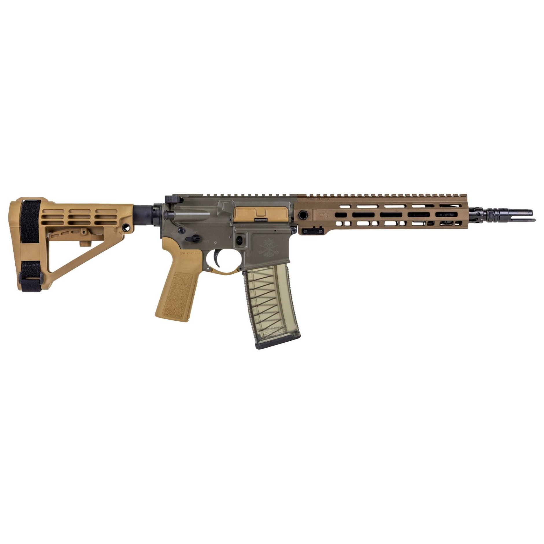 Lower: Palmetto State Armory complete Sabre-15 lower with SBA4 Brace in RAL8000 and B5 P23 grip in RAL8000. Moss Green Cerakote finish. Marked multi-caliber. Comes Standard with Sabre S5 9 Position buffer tube, Springco Green Rifle Length Buffer Spring, H1 Buffer. Battle Arms Development Pivot/Takedown Pins, Sabre 2-Stage DLC Trigger and JP Reduced Power Springs