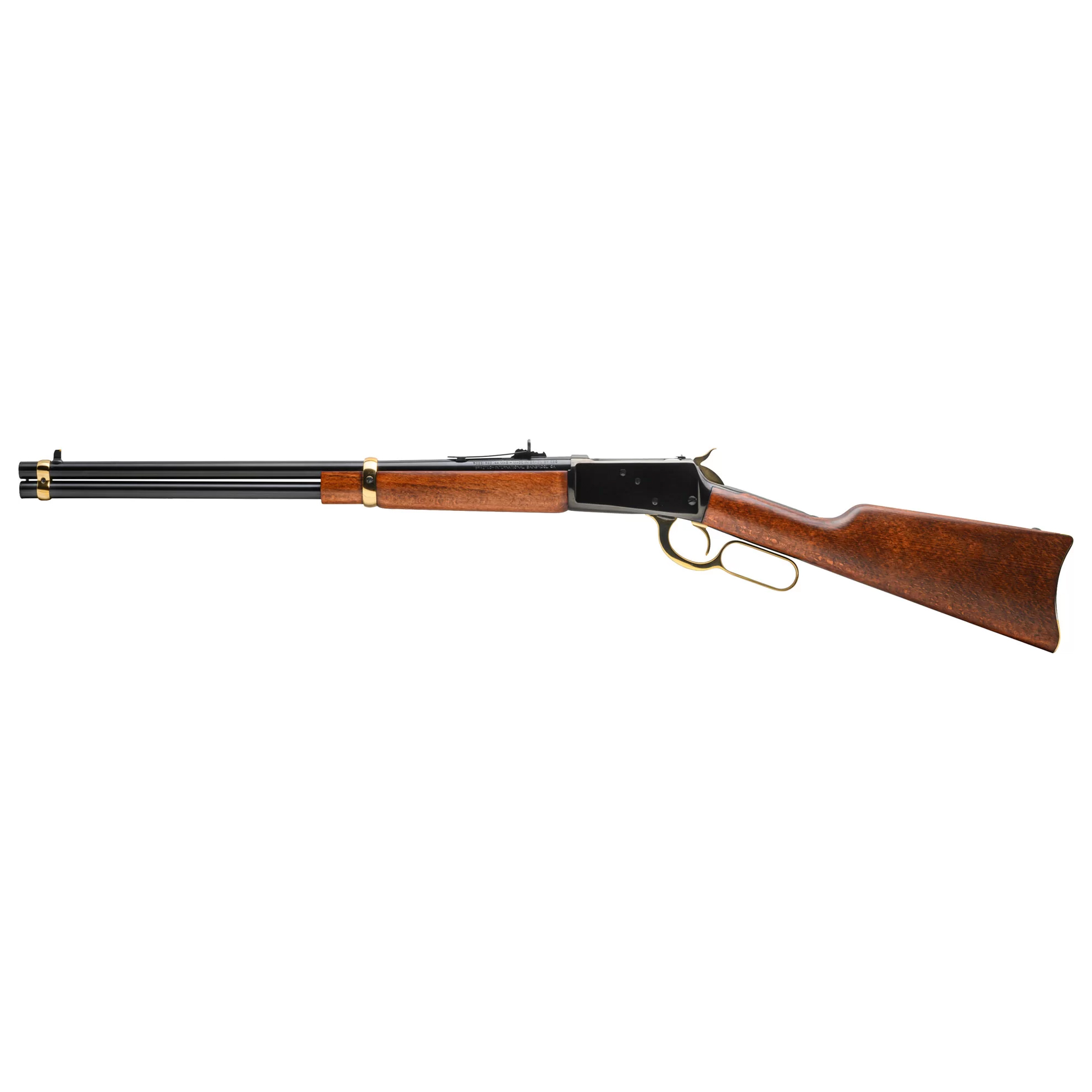 Boasting classic western styling with a flair, the R92 Gold rifles showcase a premium Brazilian hardwood forearm and stock with a traditional crescent buttplate. Providing an elegant accent to the polished black receiver, barrel, and magazine tube finish are gold finish barrel bands, hammer, trigger, lever and buttplate.