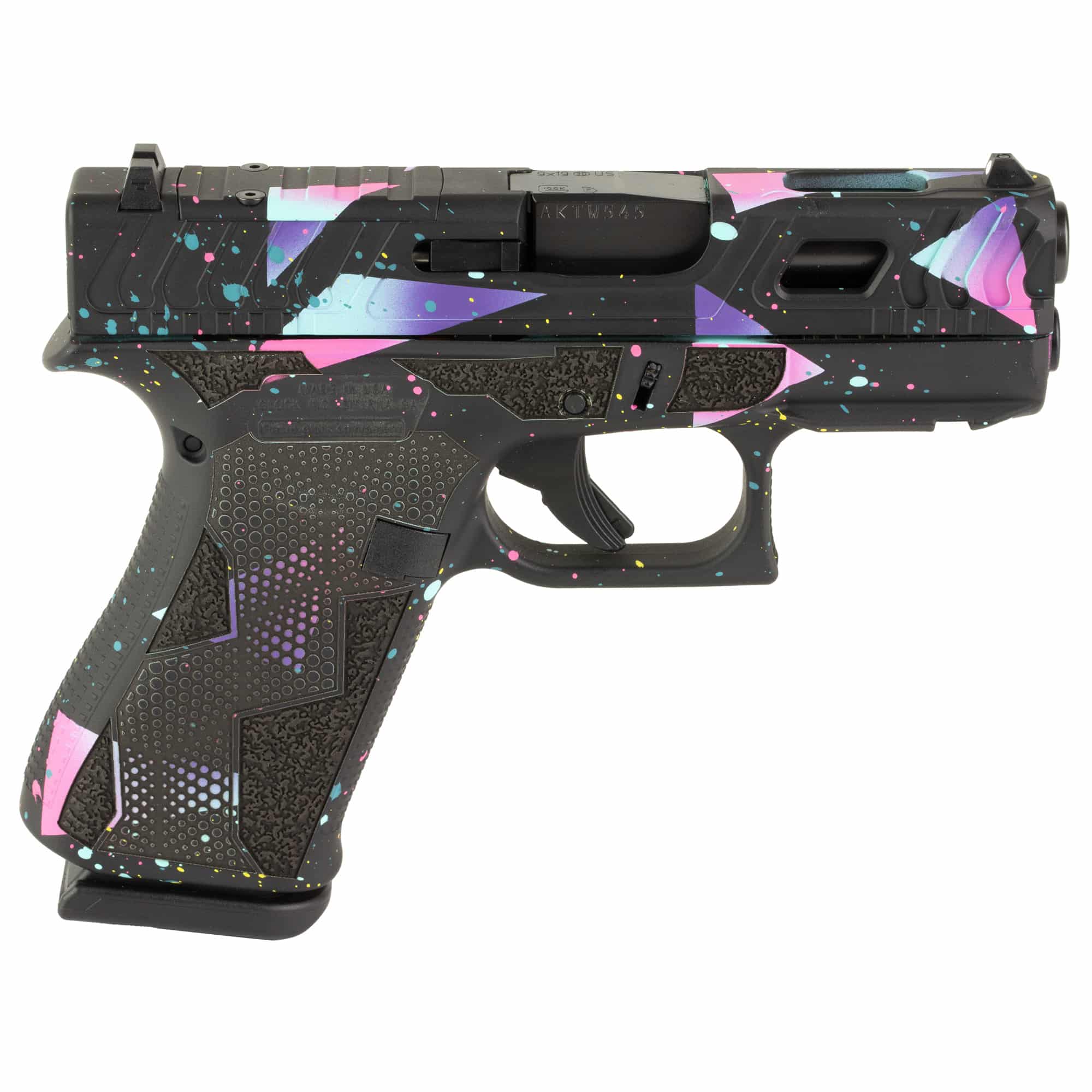 The 80’s Night Glock 43X from Shark Coast Tactical is a stylish firearm that takes inspiration from the bold geometric shapes of the 1980s. The gun features a black base color with vibrant cyan and purple triangles on the slide and grip, creating a striking visual contrast. The Shark Coast Tactical Greasy Slide allows for easy attachment of an optic. The Hybrid Geometric Stipple Design on the grip provides a comfortable and secure hold, making it a functional and fashionable option for firearm enthusiasts.