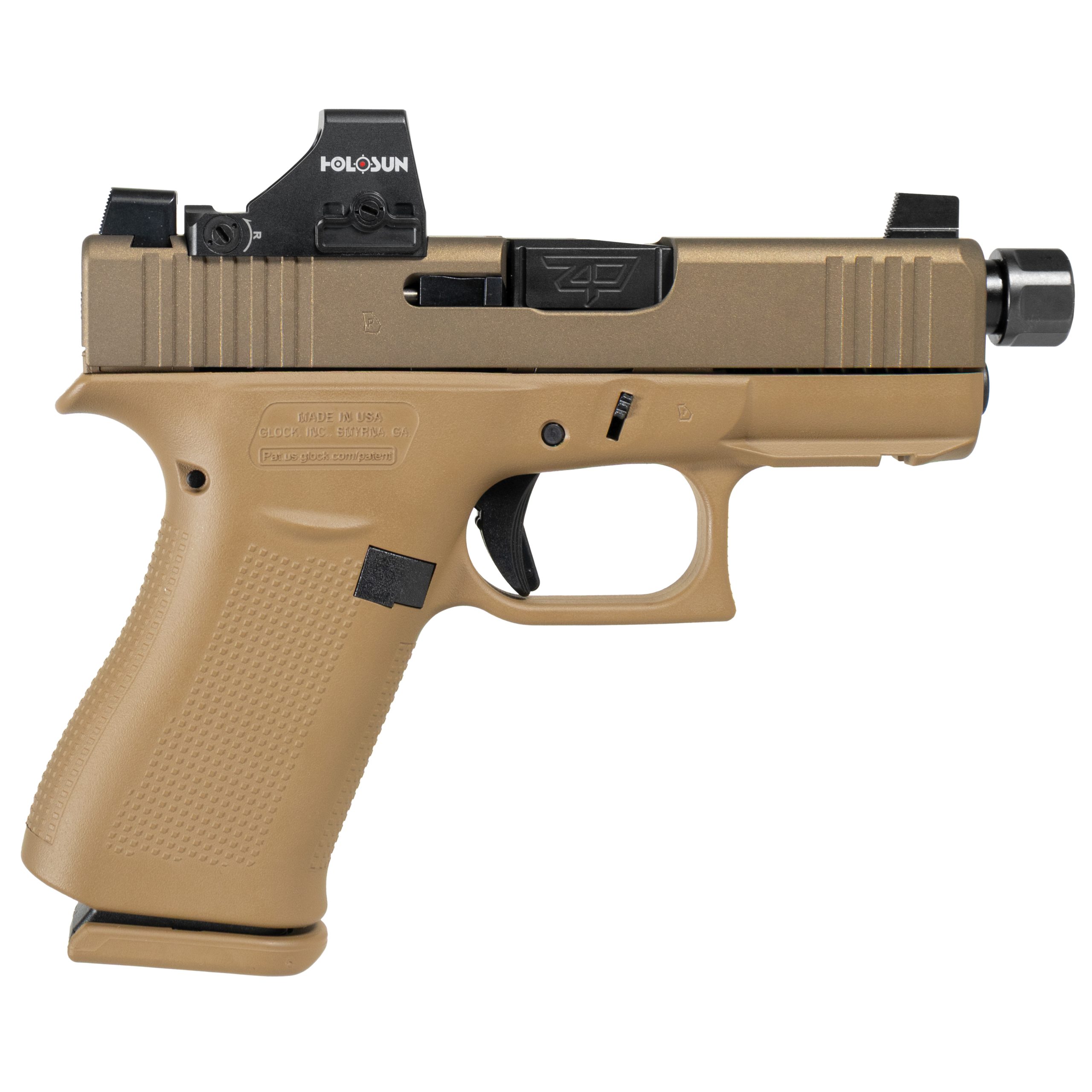 FDE Cerakote Finish – Applied to the frame and slide, the flat dark earth Cerakote coating offers both rugged durability and a distinct custom look, protecting against wear, moisture, and corrosion.
