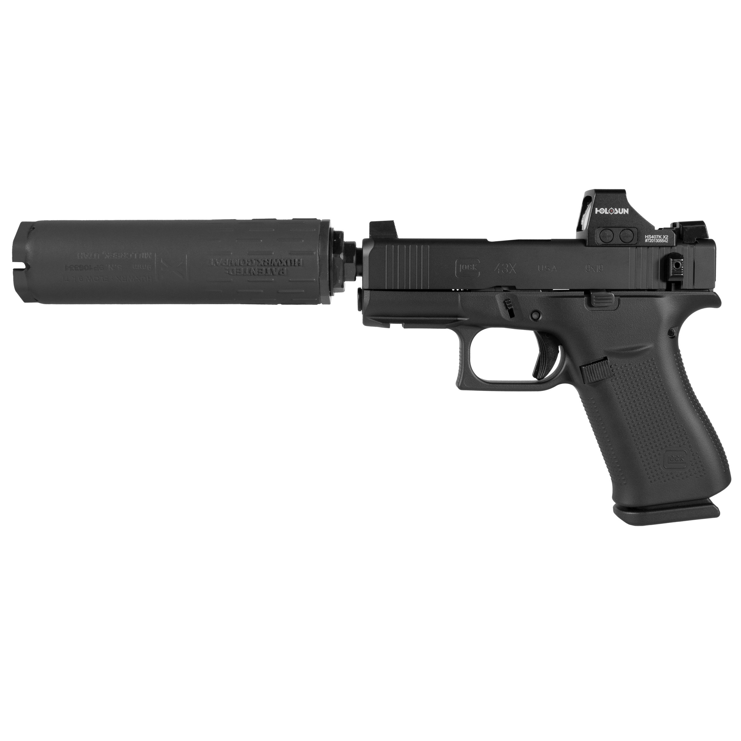 HUXWRX Flow 9K Ti Suppressor – The centerpiece of this package, the Flow 9K Ti is a lightweight titanium suppressor that uses patented flow-through technology to minimize blowback and gas-to-face while maintaining outstanding suppression. Compact and highly efficient, it balances perfectly with the 43X platform.