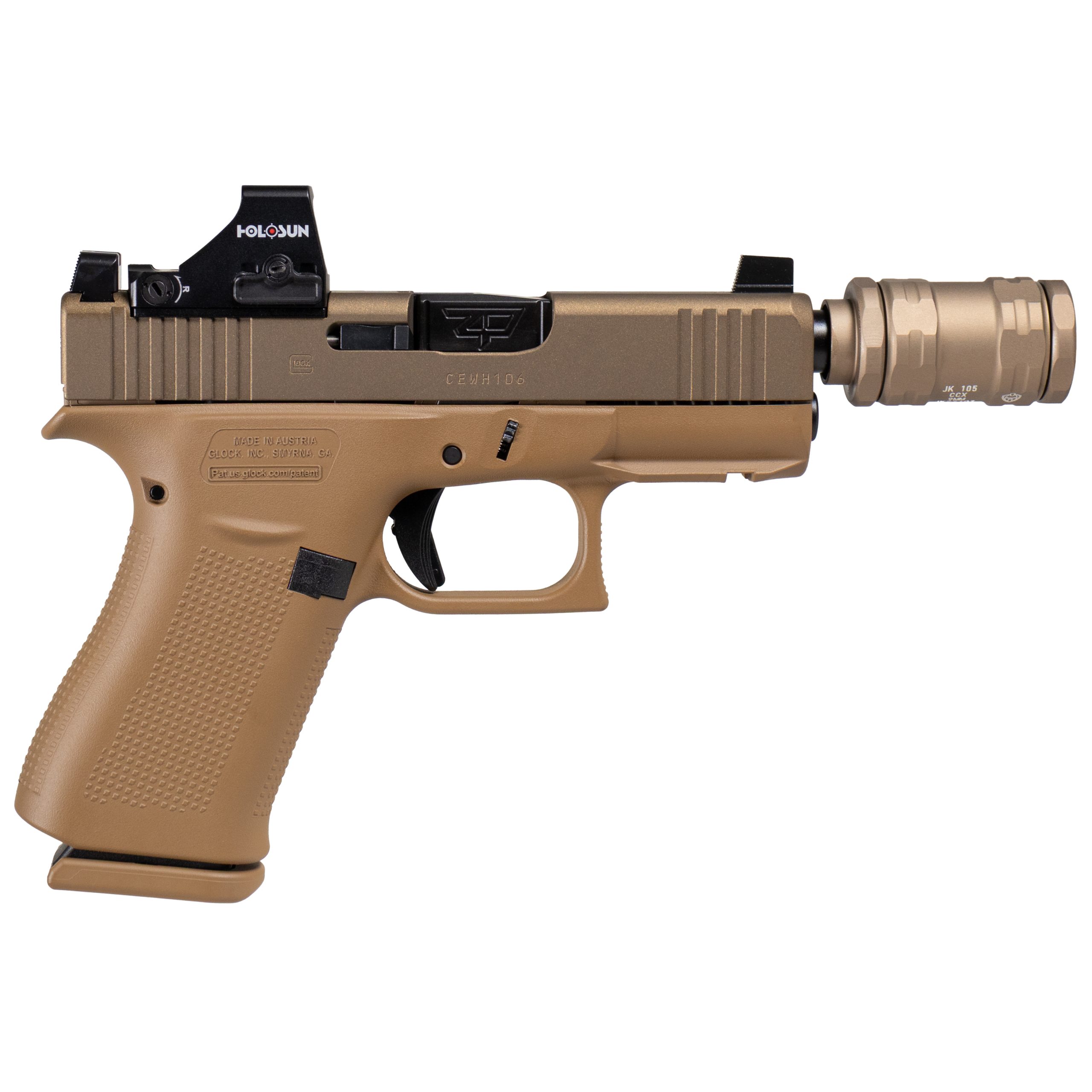 At the core of this setup is the Glock 43X MOS platform, finished in a rugged FDE Cerakote for a sleek yet durable aesthetic. It features a Zaffiri Precision threaded barrel in black, perfectly paired with the JK Armament CCX 9 modular suppressor, offering customizable length and sound suppression in a lightweight, user-serviceable format.