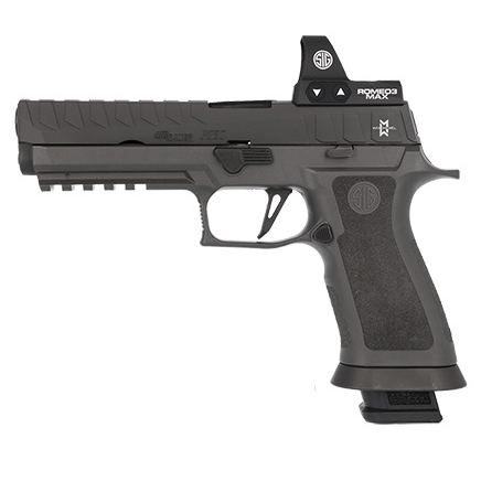 The SIG SAUER P320MAX is a 9mm striker-fired pistol optimized for competition at the highest levels, specifically in the Carry Optics division. The pistol is built around the TXG tungsten infused heavy XFULL grip module with a flat skeletonized trigger. The SIG Custom Works P320MAX slide was completely redesigned with custom wrap-around serrations for ideal side and top manipulation and is fit with a 5” match grade bull barrel, one-piece stainless steel guide rod, and both a 14lb. and 12lb. 1911-style recoil spring, allowing for an easily customized shooting experience. The pistol comes standard with a SIG SAUER Electro-Optics 6MOA ROMEO3MAX, and (4) 21rd Steel Magazines…enough for any competition set-up.