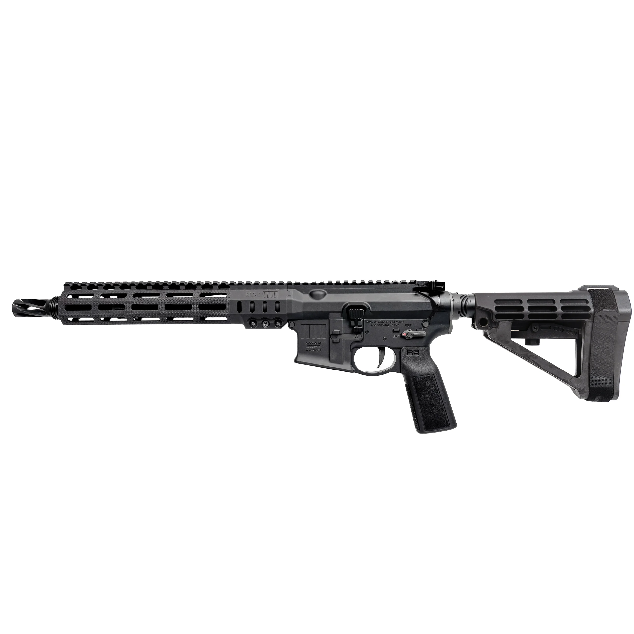 The enhanced A5 Length Buffer System provides superior recoil management, while also including premium components such as renowned our Bolt Carrier Group coated in NP3, Liberty Charging Handle with small handles, Liberty 2-stage Trigger, and an ambidextrous Badger selector. Comes standard with B5 grip and SBA5 brace.