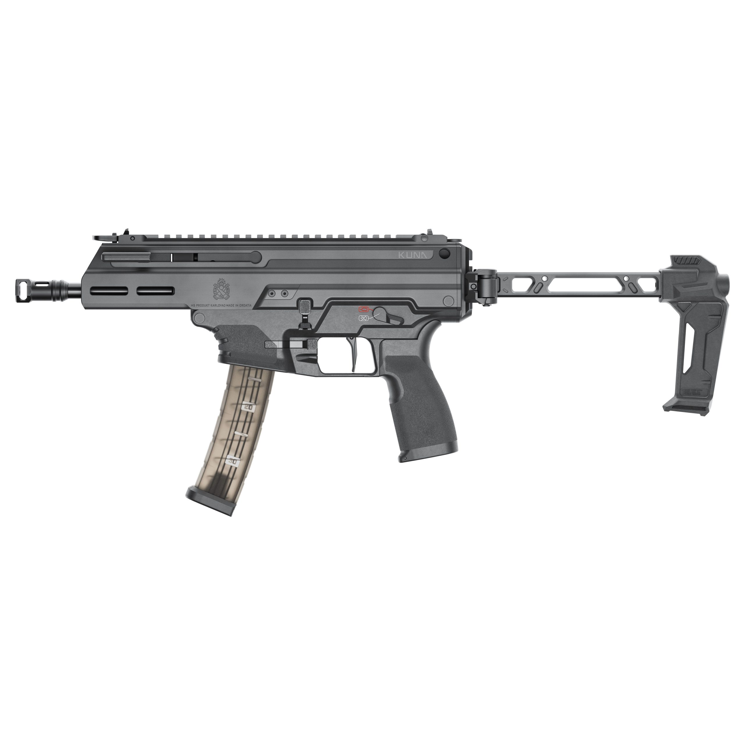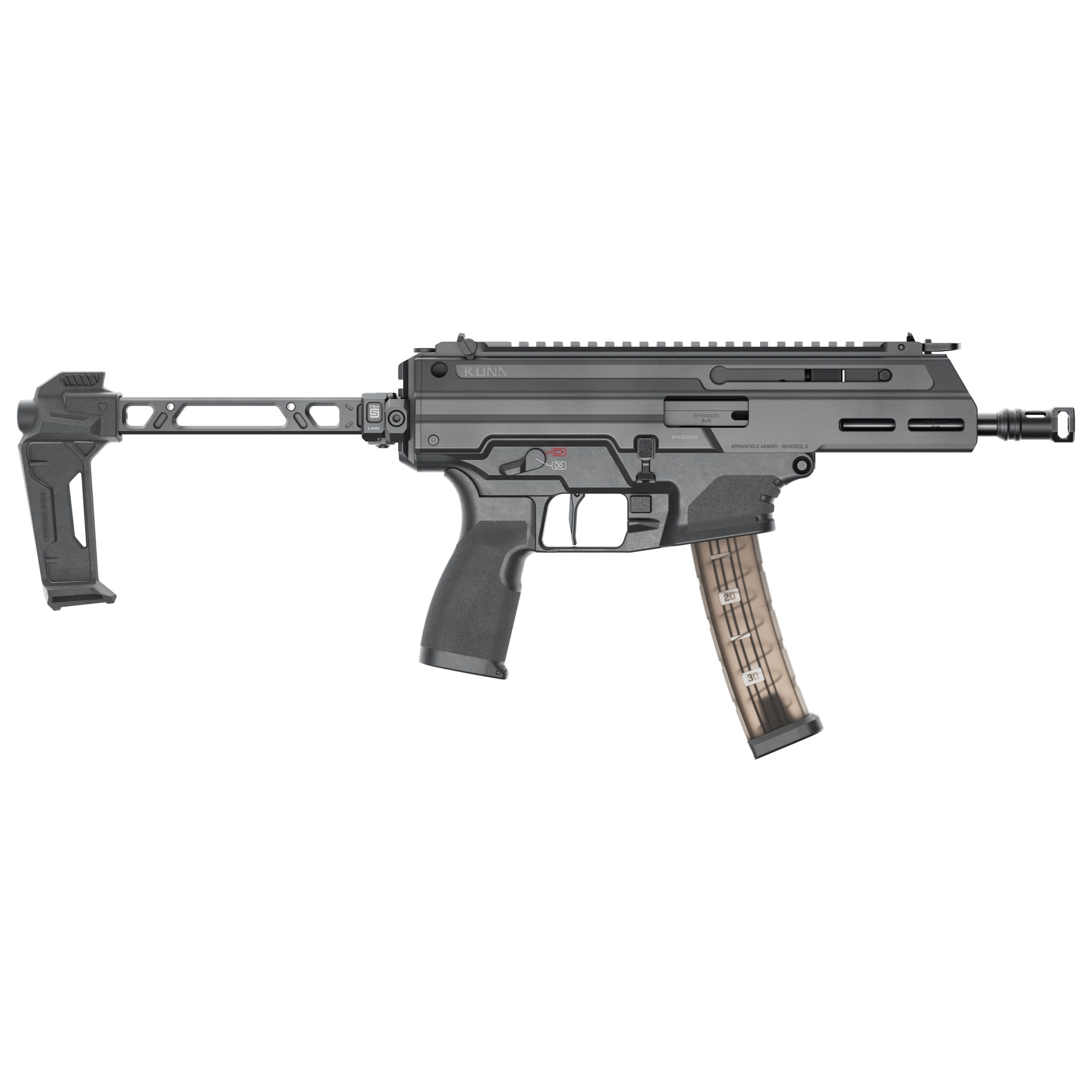 Designed to deliver exceptional shooting stability in a portable package, the Kuna houses a roller-delay operating system that dramatically reduces felt recoil and enhances control. Chambered in 9mm, it features a 6” threaded barrel with a muzzle brake, hybrid flip-up sights, and a 30-round translucent magazine with metal feed lips for reliable operation. Fully ambidextrous controls ensure seamless engagement for any shooter, while the non-reciprocating charging handle keeps handling smooth and unobstructed. The included Strike Industries FSA folding brace is attached to the integrated Picatinny rail end plate further enhancing shooting stability.